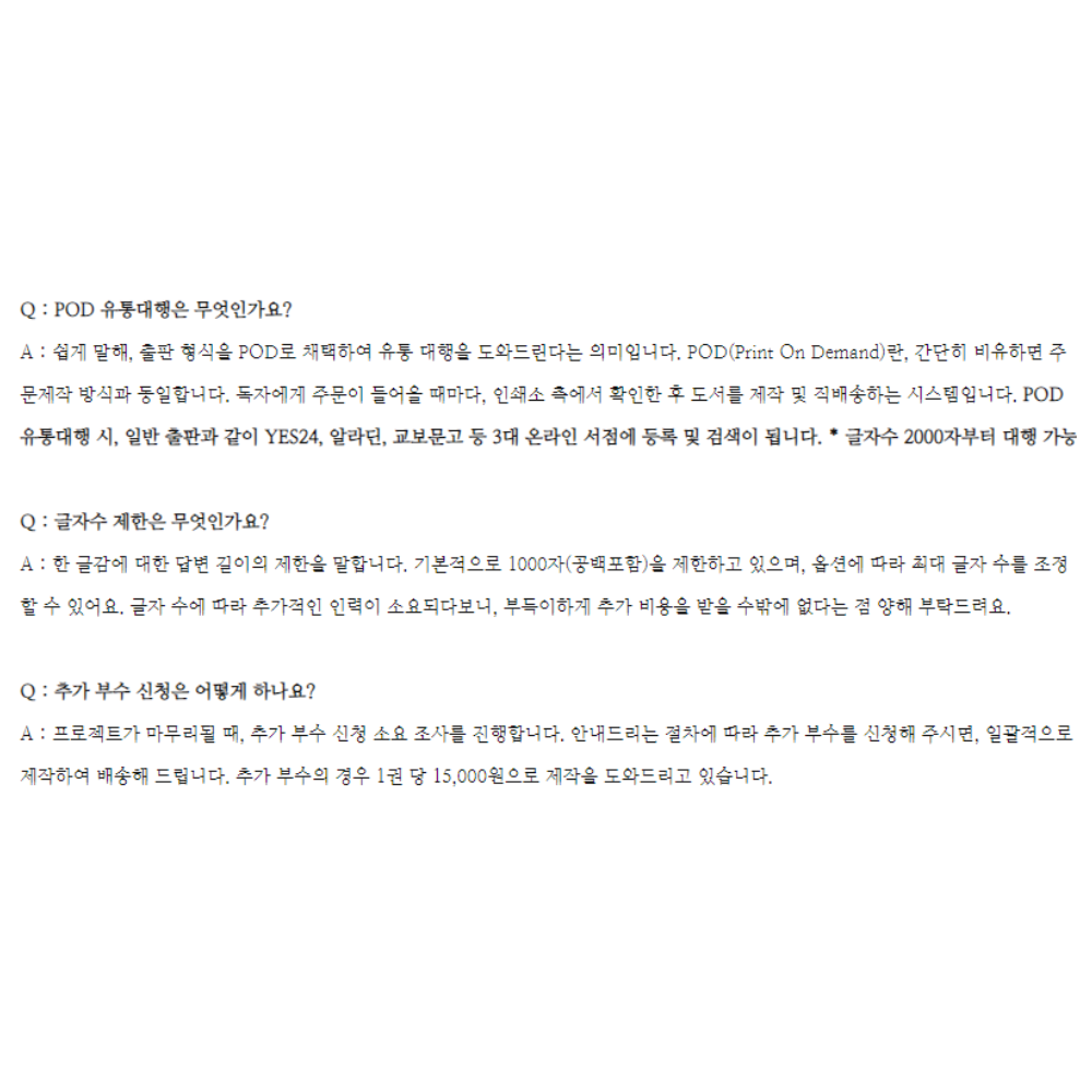 A : 쉽게 말해, 출판 형식을 POD로 채택하여 유통 대행을 도와드린다는 의미입니다. POD(Print On Demand)란, 간단히 비유하면 주문제작 방식과 동일합니다. 독자에게 주문이 들어올 때마다, 인쇄소 측에서 확인한 후 도서를 제작 및 직배송하는 시스템입니다. POD 유통대행 시, 일반 출판과 같이 YES24, 알라딘, 교보문고 등 3대 온라인 서점에 등록 및 검색이 됩니다. 아울러, 향후 도서 판매 시 도서 정가의 10퍼센트를 저작권료로 지급드립니다. POD 유통으로 온라인 서점에 도서가 등록되면, 한국의 문학인으로 증빙 가능하고 예술 활동 증명 등 복지 혜택을 받으실 수 있습니다. * 글자수 2000자부터 대행 가능